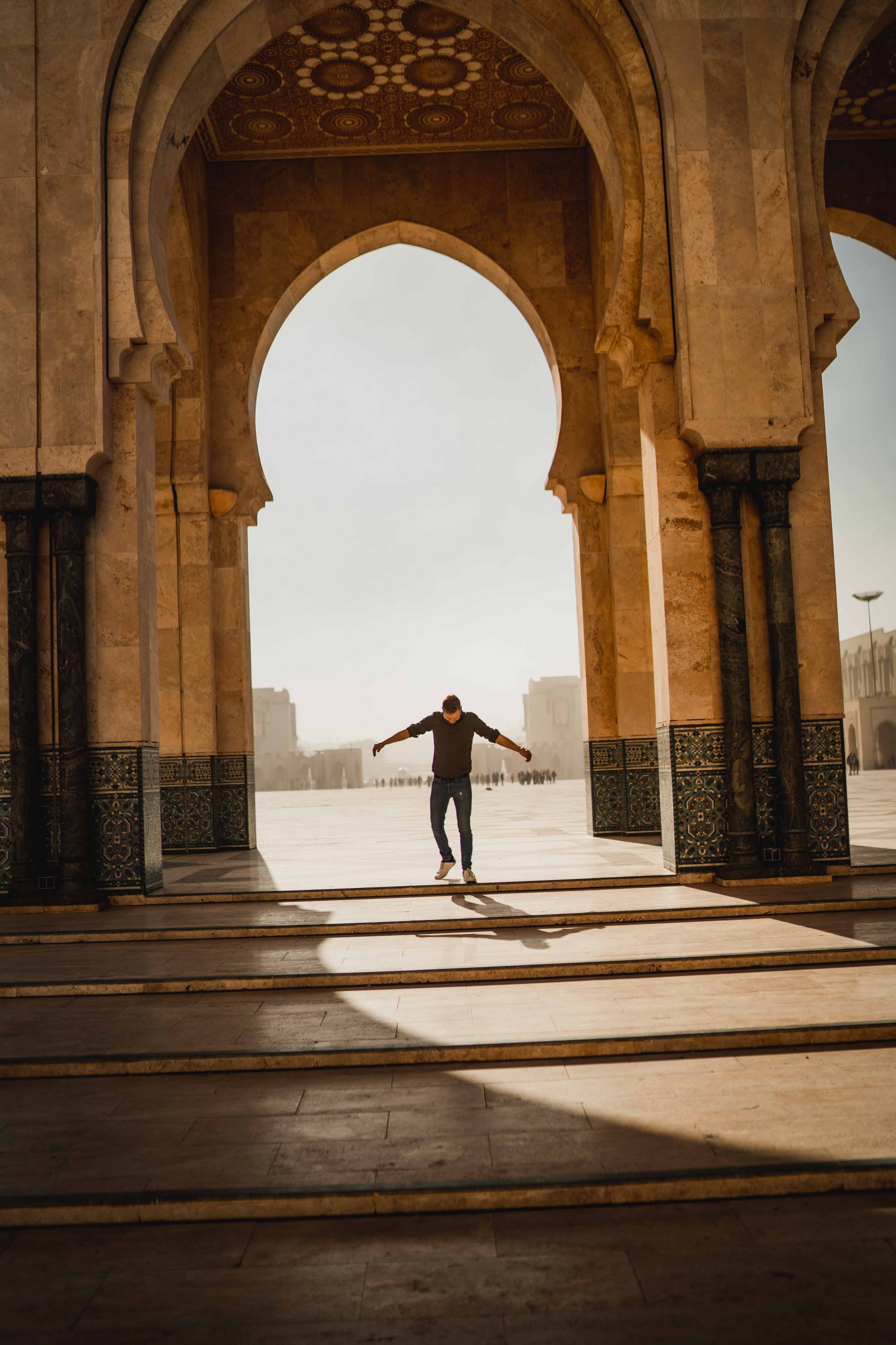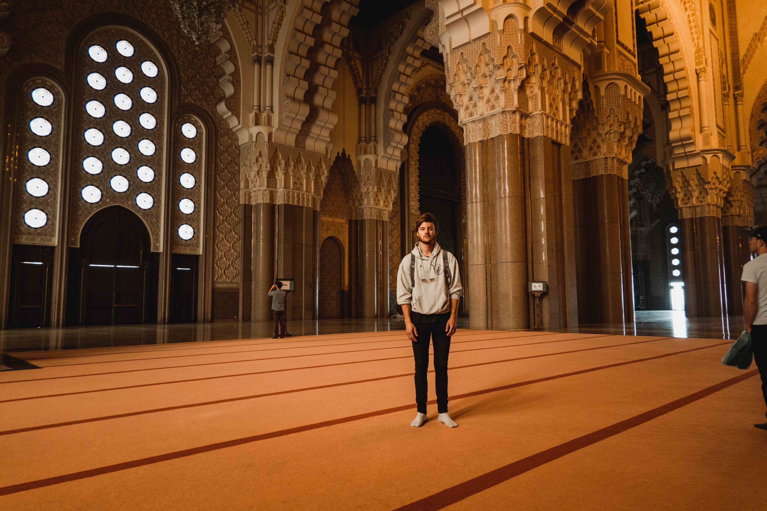 After breakfast we went into the Hassan Mosque. It is the third biggest Mosque in the world and the biggest mosque in Africa. It can take up to 25.000 prayers inside and another 80.000 outside. That’s massive. Just imagine more than a 100.000 people on one single big square. So shoes off and in! I was a bit nervous as this was my first time visiting a mosque. Pictures can’t describe how huge this place is. 5m wide 60m high granite pillars gave the building it’s structure. As a European you see grievances fast. Morocco has many grievances. One is that the money is apparently there but invested at the wrong places and into the wrong things because of corruption and capitalism. Our Mosque guide said that the Hassan Mosque was built in the 90th with many criticism. Money wise this mosque was way too big for a country like Morocco. It then got funded by public donations and private investors. It’s a impressive and beautiful building, yes, but if you ask me this money would have been needed elsewhere. Especially in the ghettos in front of the town where people are hungry.